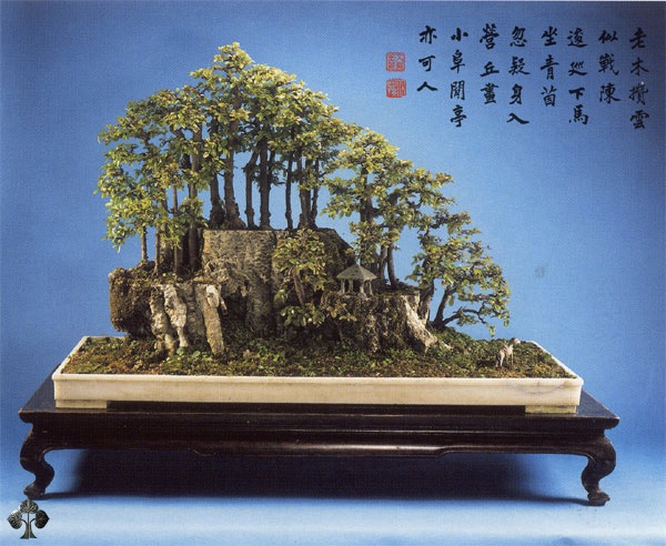 Dette vidunderlige kinesiske landskab tilhører Man Lung-kollektionen i Hong Kong. Træerne er kinesiske fugleblommer (Sageretia Theezans) og udgør tilsammen et meget realistisk landskab. I kollektionen er Ficus bonsai også populære. I dette landskab er træerne, klippen og miniaturefigurerne placeret på en lavvandet rektangulær skål (lavet af marmor), som igen vises på et antikt bord.